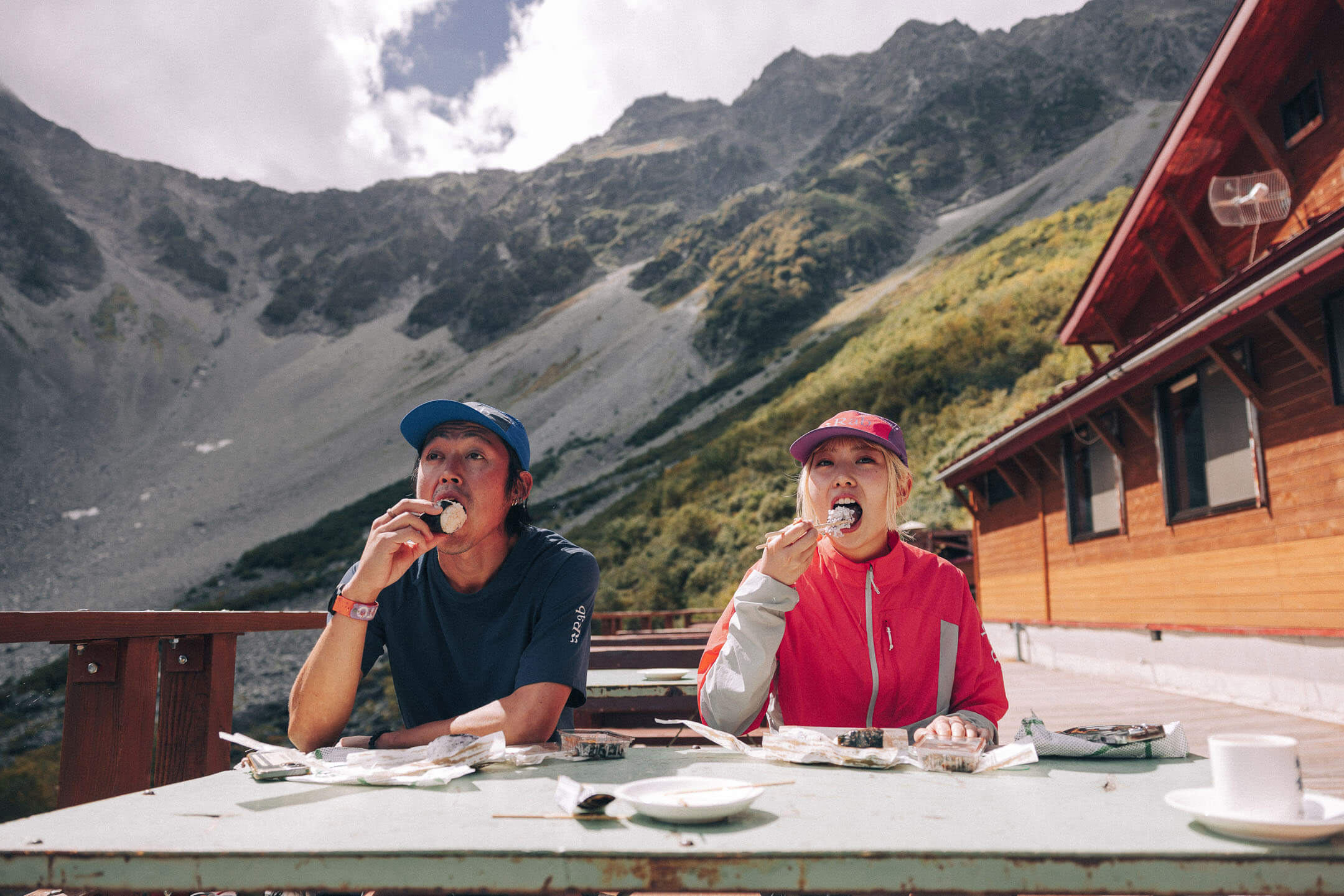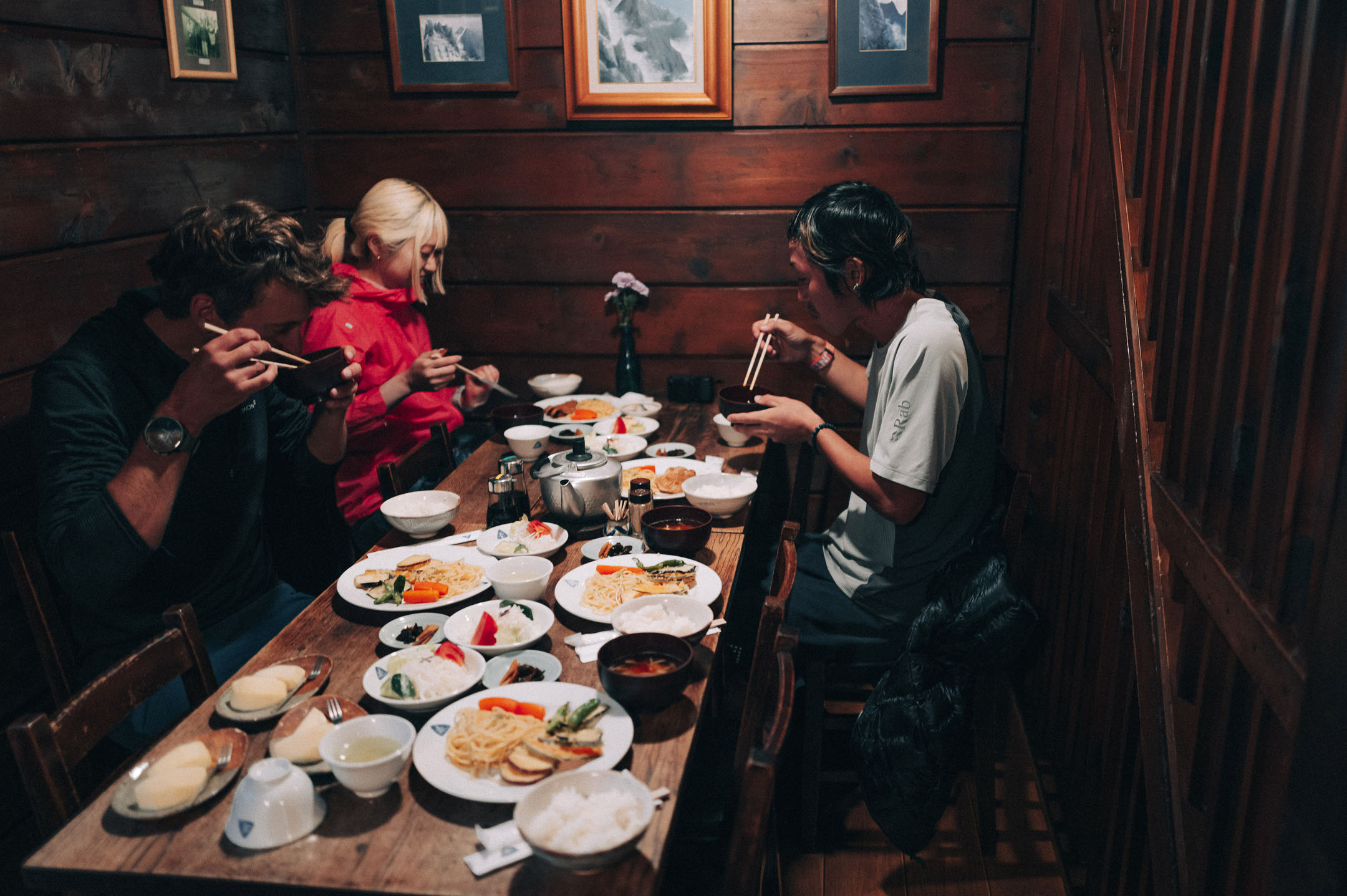 After long days on the trail, the mountain huts turned out to be welcome refuges. Booking them required calling ahead and, of course, good Japanese. “It was quite hard to get availability for all five of us at a time,” remembered Jake. Sleeping arrangements were simple with futons on wooden platform bunks, not unlike European alpine huts, but what really stood out was the food. “Genuinely incredible food,” said Jake, “not even considering the fact that you’re 3,000 metres up.” Unlike the repetitive, carb-heavy meals typical of French, Swiss and Italian huts, the Japanese served up beautifully balanced traditional fare: miso soup, unlimited rice, an array of pickles, and small plates of vegetables, fried fish, or meat. “It was one of the highlights of the trip, for sure. I think food always tastes good when you've been out in the mountains all day but the Japanese have such a respect for food, it felt more like a ritual sitting down and sharing the meal each night.” Despite the language barrier limiting conversation, the shared experience of sitting down together after a big day on the trail created a sense of connection between the team.