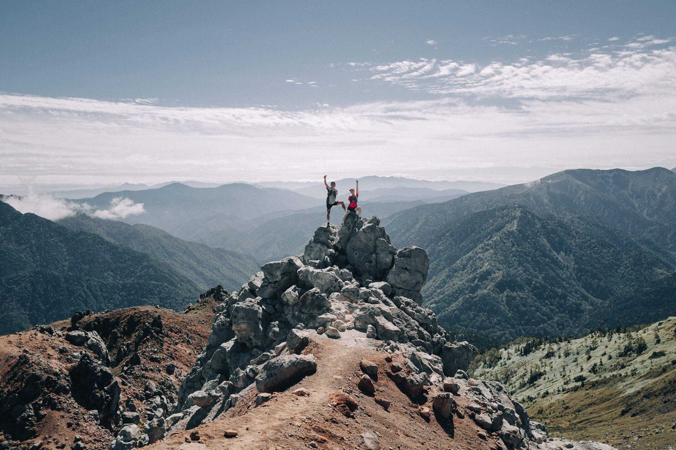 After four days on the trail in a mix of conditions, running, exploring and setting up shots, it was time for the FKT attempt. The VK route up Mt Yake-dake (or “the burning mountain”) leads from thickly forested trails up to loose rocky paths, where the ladders assist with an airy scramble to the rim of the summit crater. “It’s quite an inviting mountain because it’s so prominent from the town of Kamikochi,” said Jake. The idea was for the whole team (except for Matt) to set off in stages, sending the fastest runner last (Yusuke), and allowing a ten-minute gap between each of them, so they would summit around the same time. “We gave Yusuke a little action camera so he could film himself. Matt went up about half an hour before us and waited at the top with his drone. And I wanted to make sure I would get there ahead of the athletes so I could get pictures of them finishing,” said Jake. Despite a humble chorus of “I won’t be that fast”, the athletes smashed the existing FKT record by several minutes each, with Aoi reaching the summit a full 30 minutes ahead of the time she predicted. “Obviously we’d just done four big mountain days and so they were both pretty ruined at the top,” Jake remembered. “I was honestly a bit worried Aoi might be about to have a heart attack…”